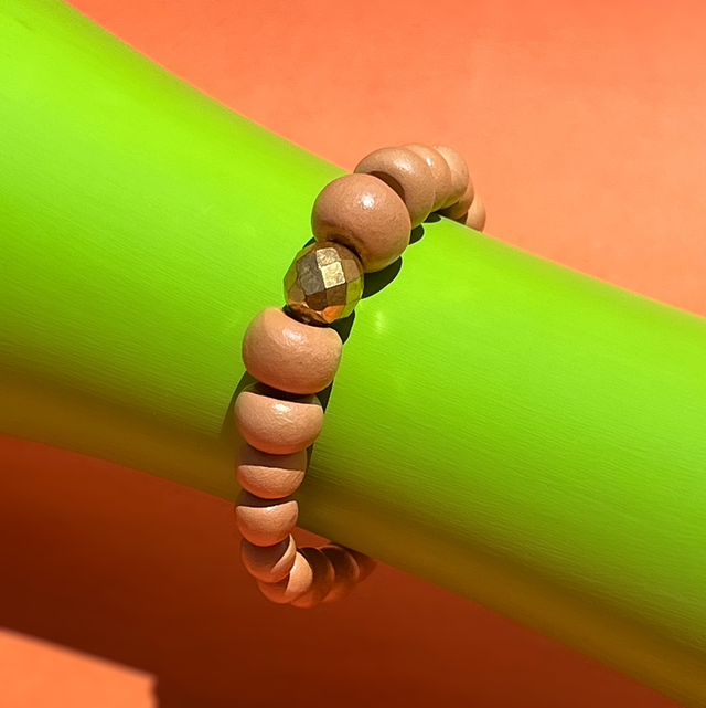 Pulseira em Cerâmica Natural modelo Bolas Lisas com detalhe em Cristal Dourado Fina
